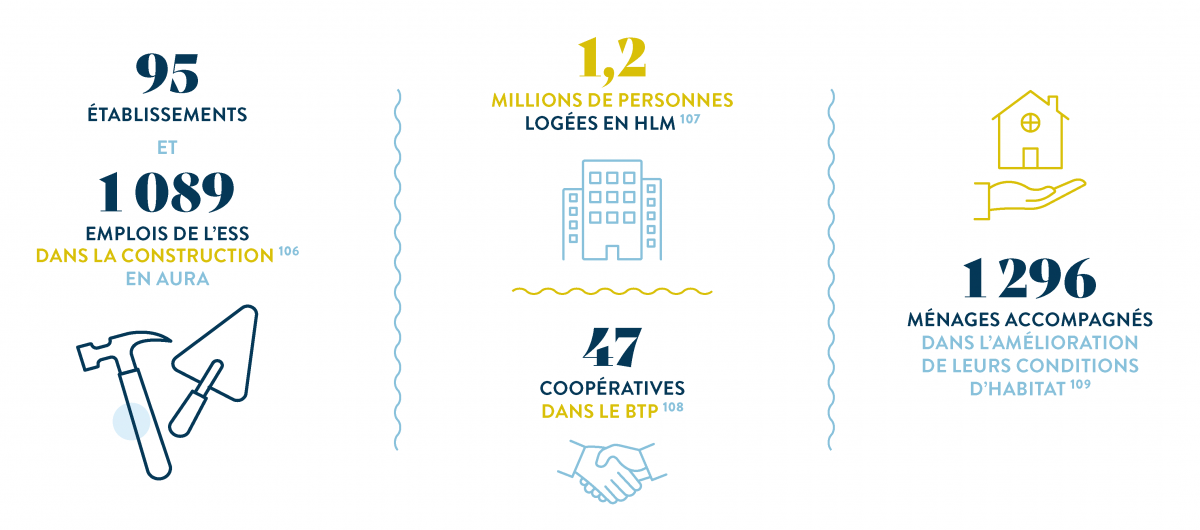 Sources : 106 Estimation régionale d’après les chiffres nationaux – INSEE FLORES 2018 • 107 AURA HLM, Rapport d’activité 2021 • 108 Annuaire Fédération SCOP BTP • 109 Rapport d’activité Compagnons Bâtisseurs 2021 Auvergne et Rhône-Alpes