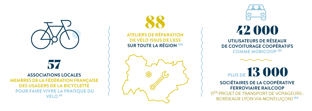 Au carrefour de la question sociale et de la question écologique, l’ESS fait valoir une mobilité plus durable et inclusive. Les trajets en voiture peuvent aujourd’hui se partager grâce à des réseaux coopératifs de covoiturage tels que Mobicoop ou Citiz, et l’accès à la mobilité pour les personnes à mobilité réduite est facilité par de nombreuses associations. La pratique du vélo et sa généralisation dépend quant à elle de dizaines d’associations d’usagers et d’ateliers de réparation implantés partout dans la région. Son usage professionnel à des fins logistiques se développe également de plus en plus avec des coopératives de livraison à vélo qui permettent de limiter la pollution atmosphérique dans les grands centres urbains tout en offrant une sécurité juridique à leurs travailleurs (CoopCycle). L’ESS se développe également désormais dans le secteur ferroviaire avec la coopérative Railcoop qui relance des lignes de train disparues afin de mailler le territoire et remplacer le fret routier, très polluant, tout en associant les acteurs du territoire à la gestion de ces lignes.
