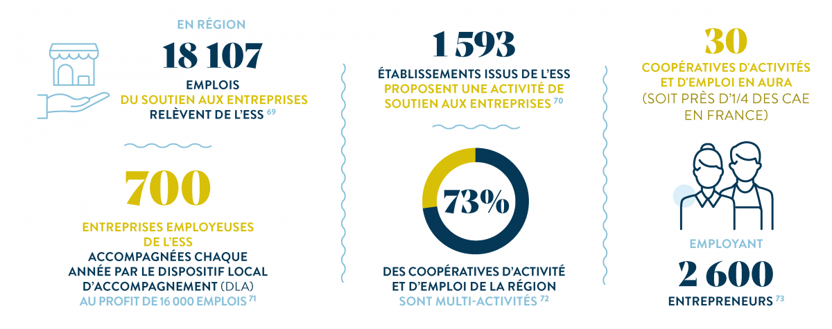 Sources : 69 – 70 INSEE FLORES 2018 • 71 Bilan 2021 du DLA en Auvergne-Rhône-Alpes, BGE Auvergne, 2022 • 72 – 73 Fédération des CAE « Actualisation des données » 2021
